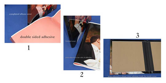 This adhesive material is used to adhere photo paper or exterior cover substrate to cardboard front or last pages of photo albums.